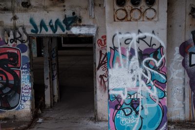 Fast alle Fenster sind entweder eingeworfen oder mit Graffiti übersprüht. Das Mauerwerk bröckelt und ist ebenfalls an vielen Stellen mit Graffiti versehen. Durch eines der zerbrochenen Fenster gelingt sogar ein Blick ins Innere. Auch dort – Verfall, Graffiti, Trostlosigkeit. (siehe Bilder Galerie)